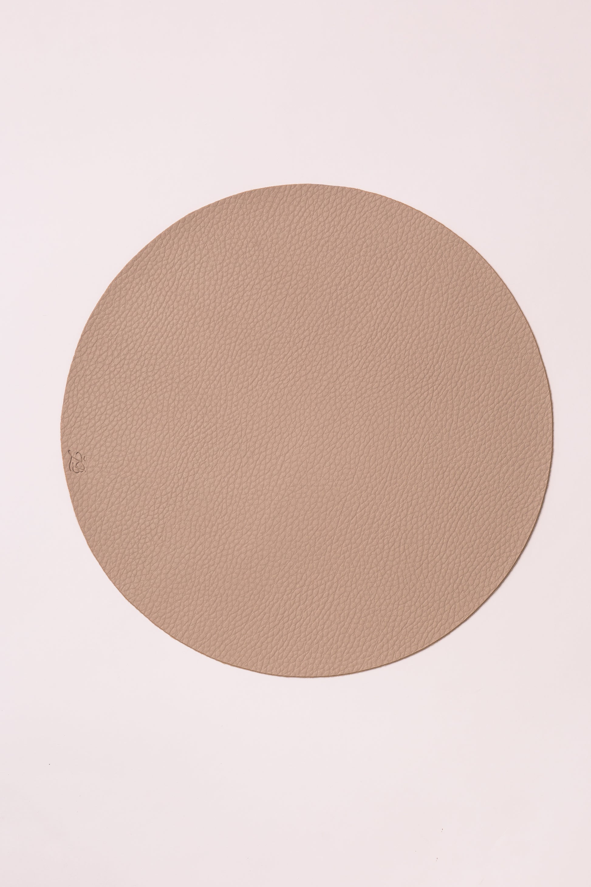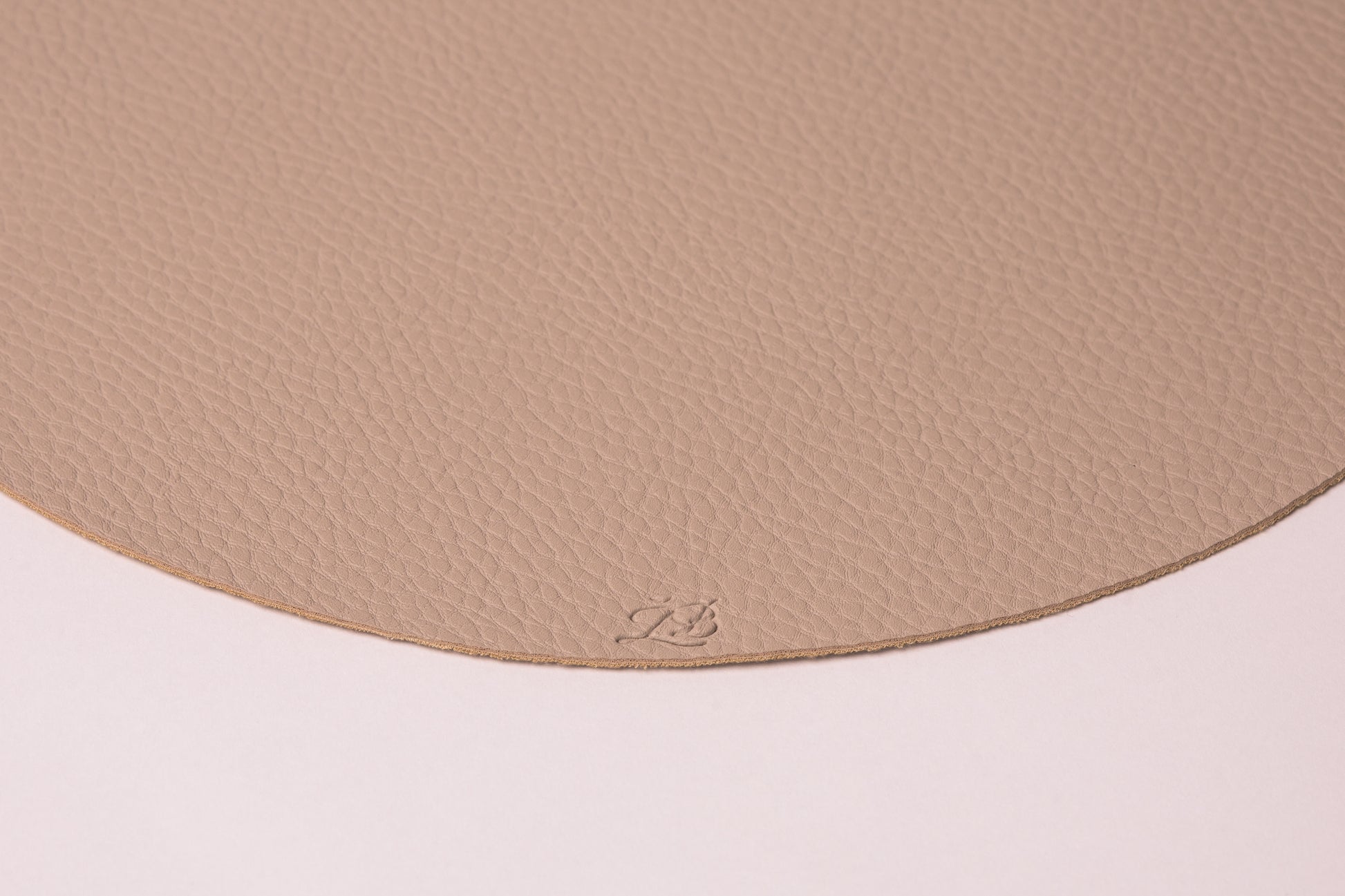 Kreminės spalvos stalo padėkliukas, su logotipu. Skersmuo 34cm. Eco oda.