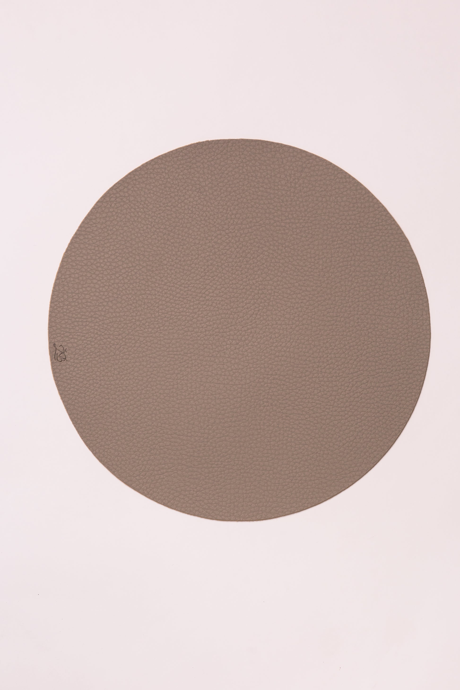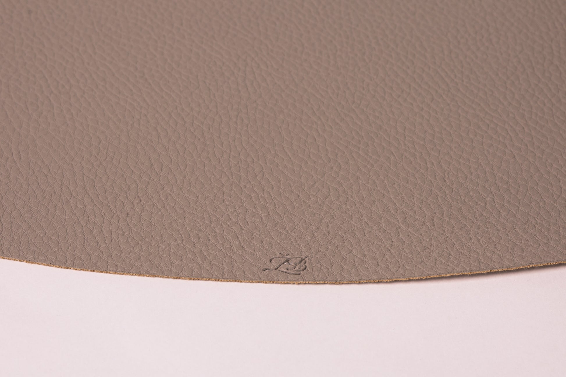 Tamsiai kreminės spalvos pilko atspalvio stalo padėkliukas, su logotipu. Skersmuo 34cm. Eco oda.