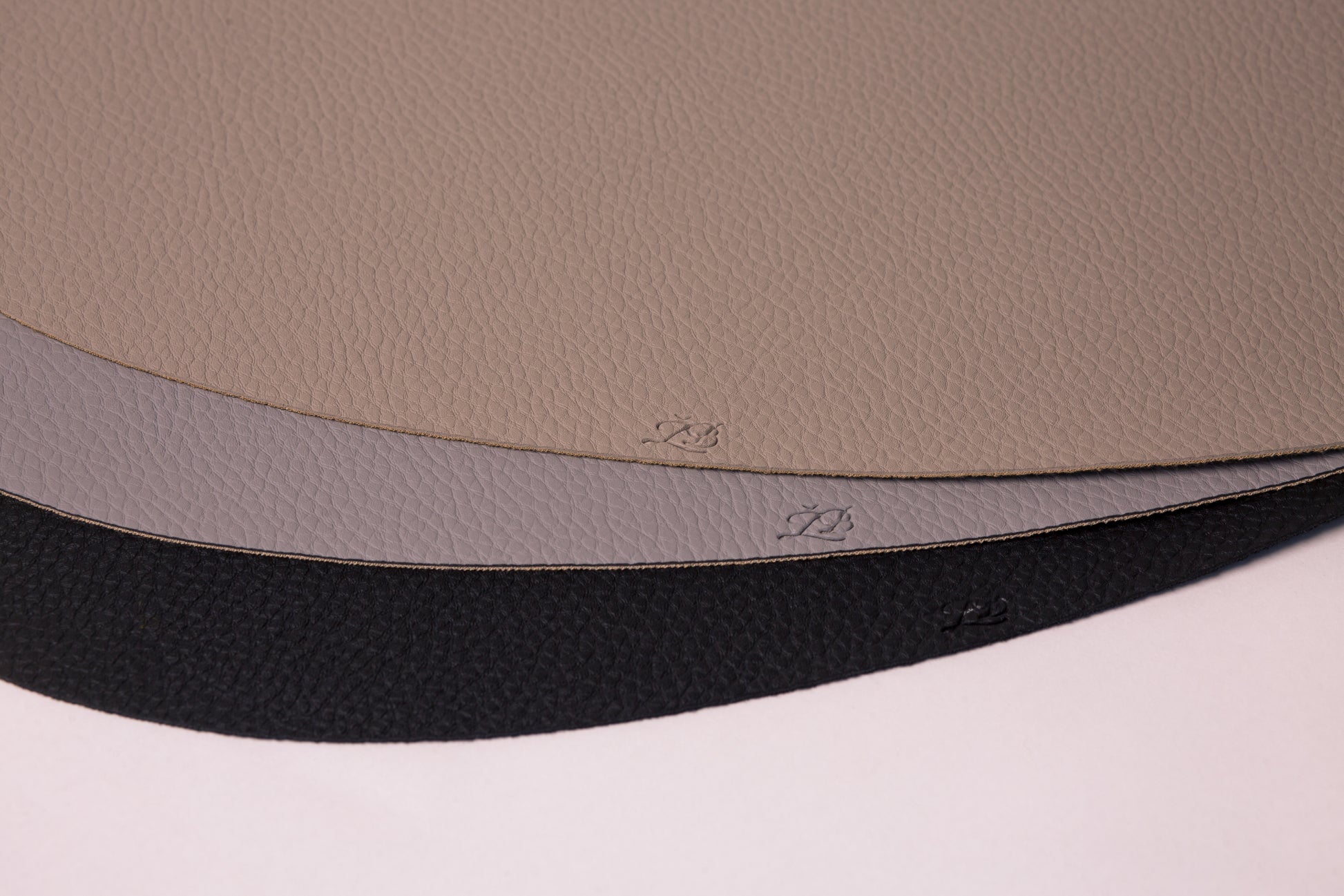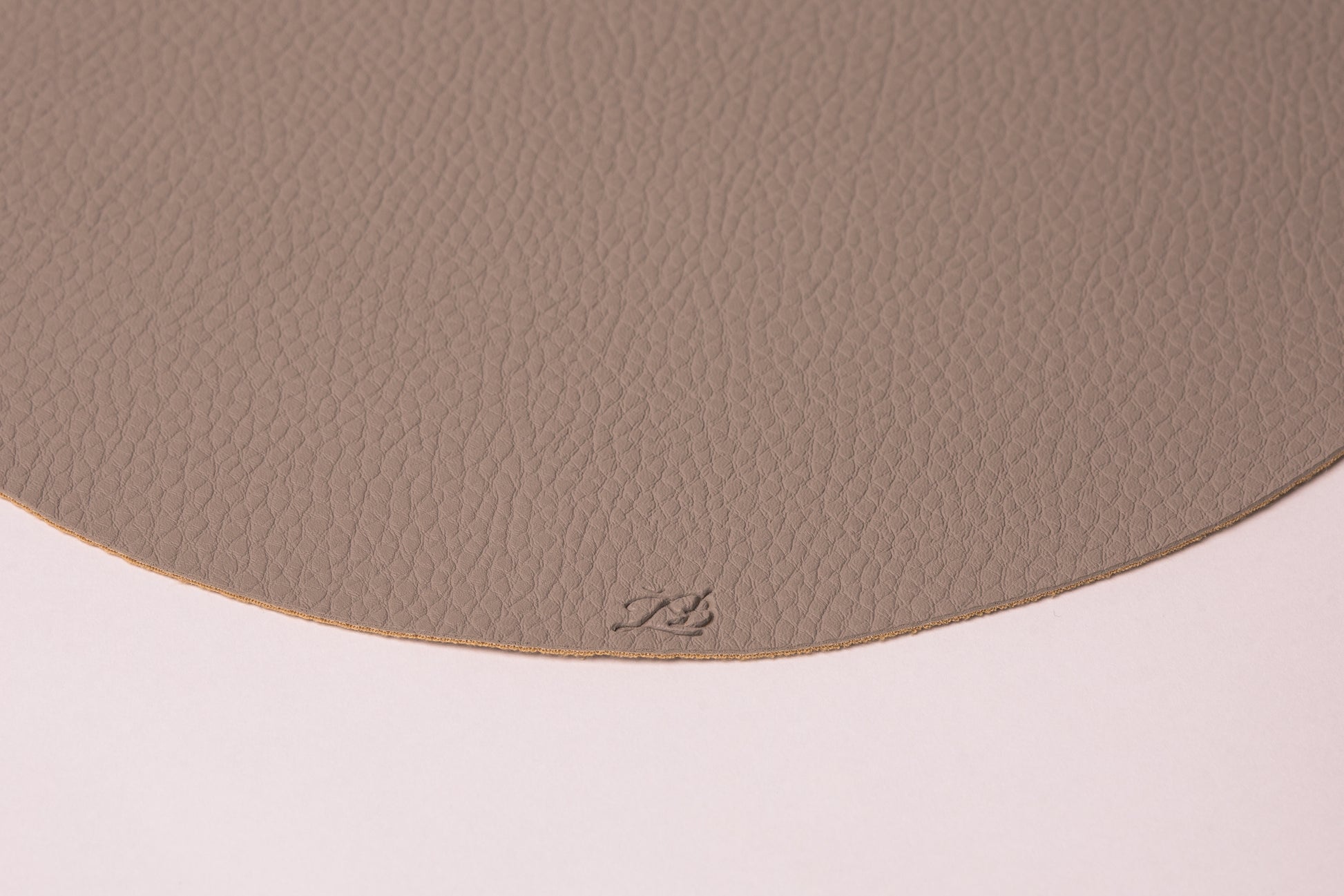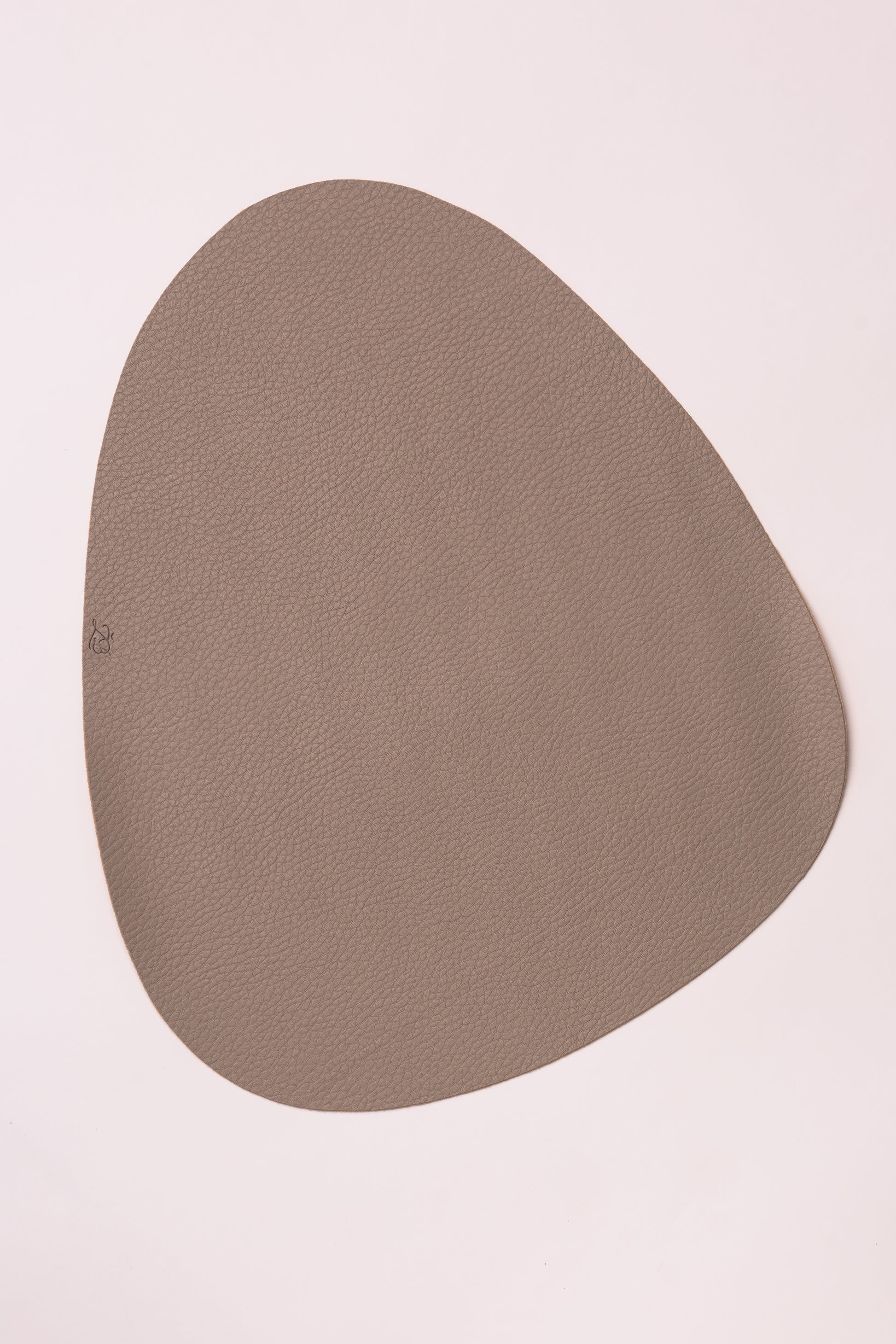 Kreminės spalvos, pilko atspalvio, lašo formos stalo padėkliukas, su logotipu. Išmatavimai 45x37 . Eco oda