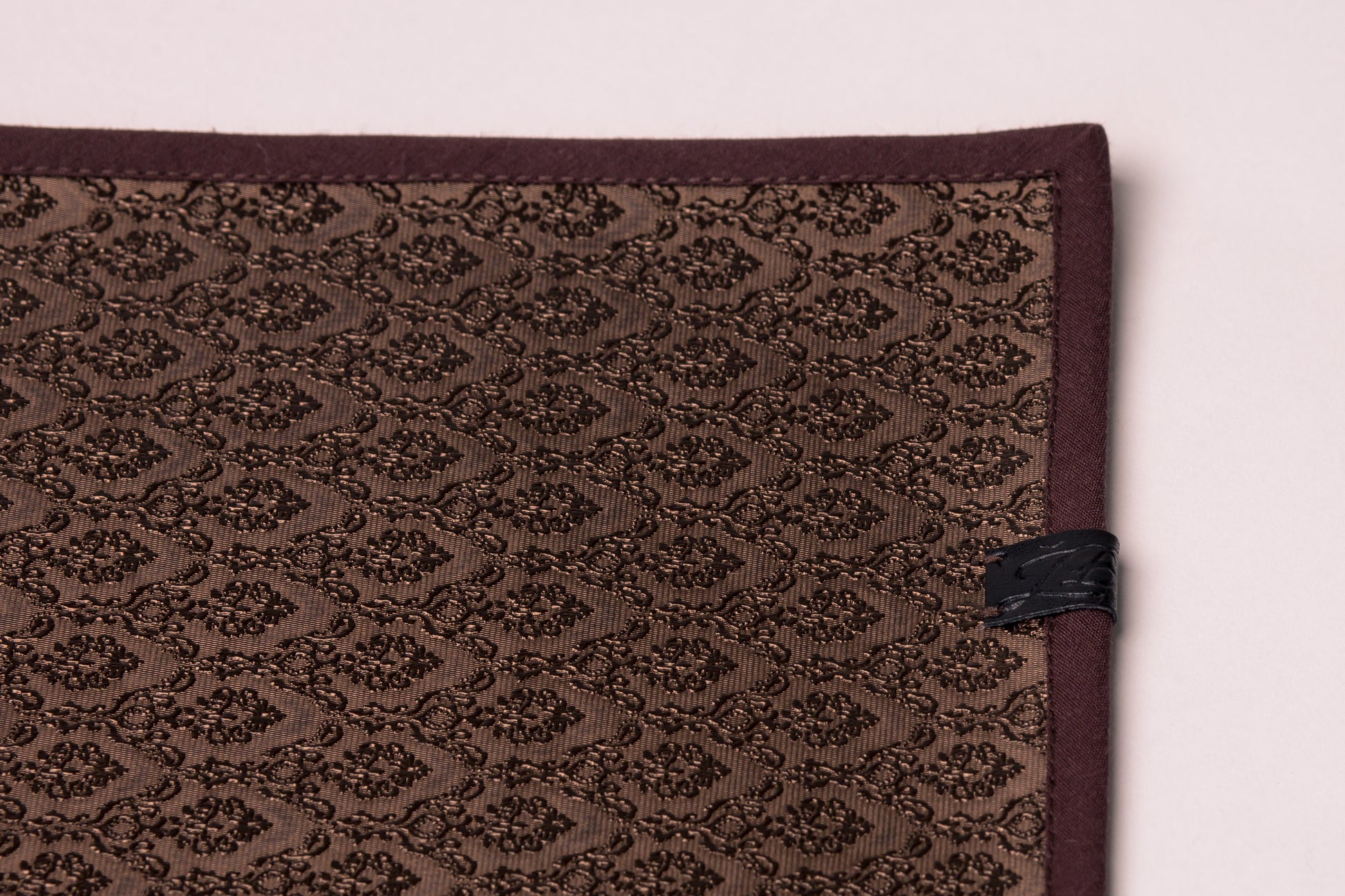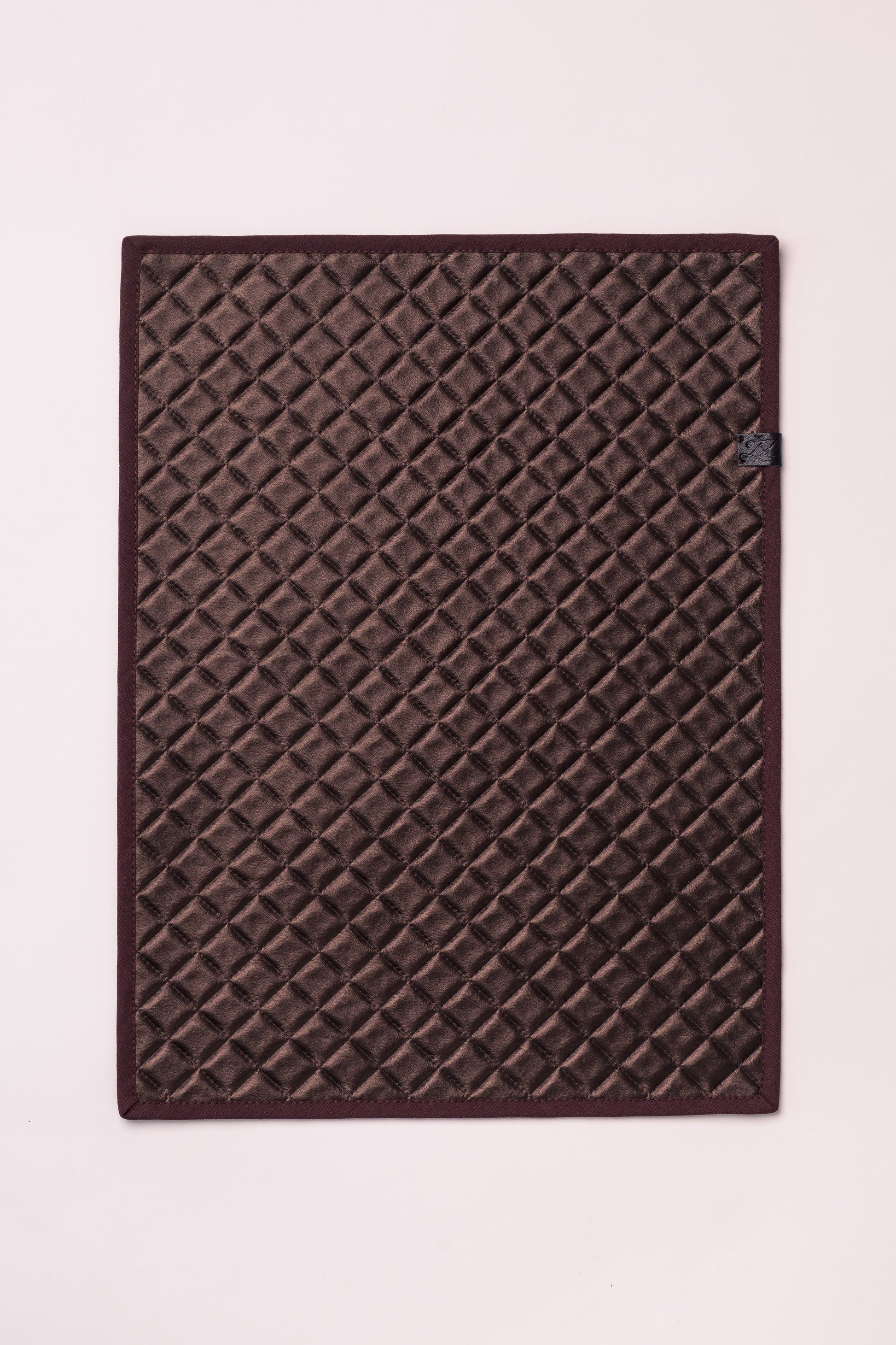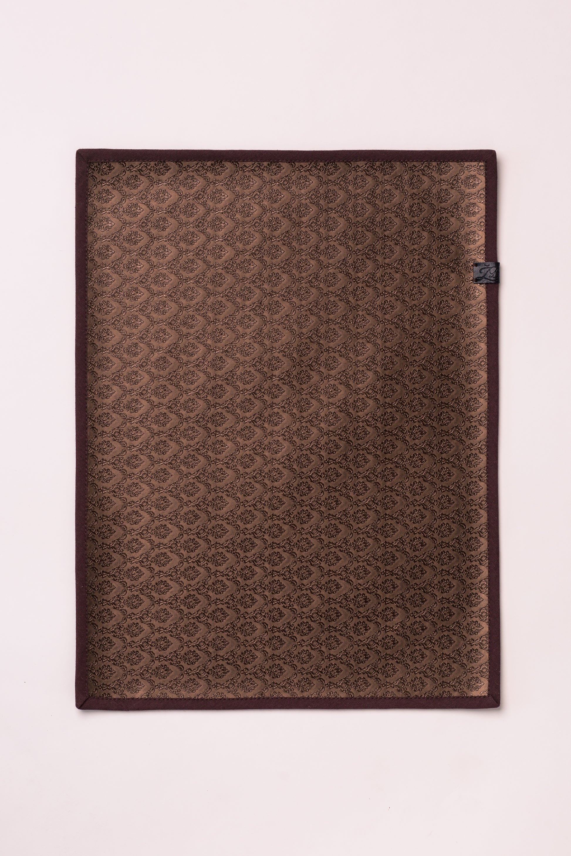 Tamsiai rudos spalvos stalo padėkliukas su raštu, stačiakampio formos, apsiūtas rudos spalvos kantu, su logotipu. Matmenys: 40x30cm. Eco oda.