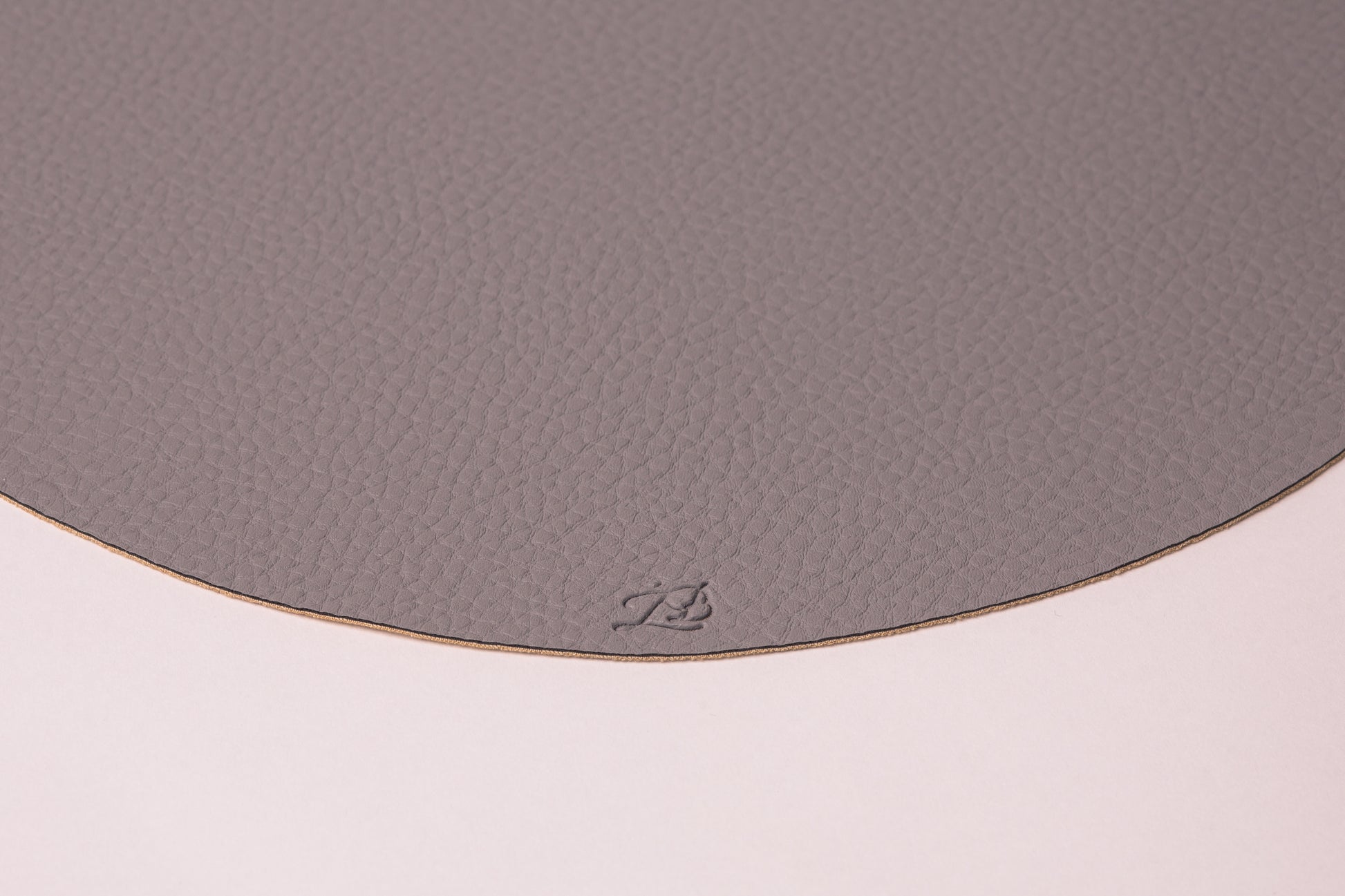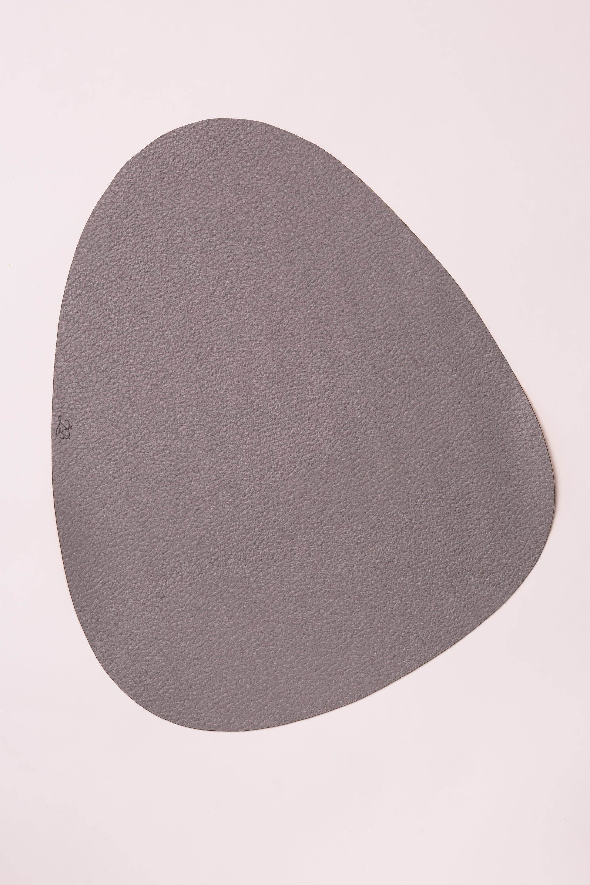 Pilkos spalvos, lašo formos stalo padėkliukas, su logotipu. Išmatavimai 45x37 . Eco oda