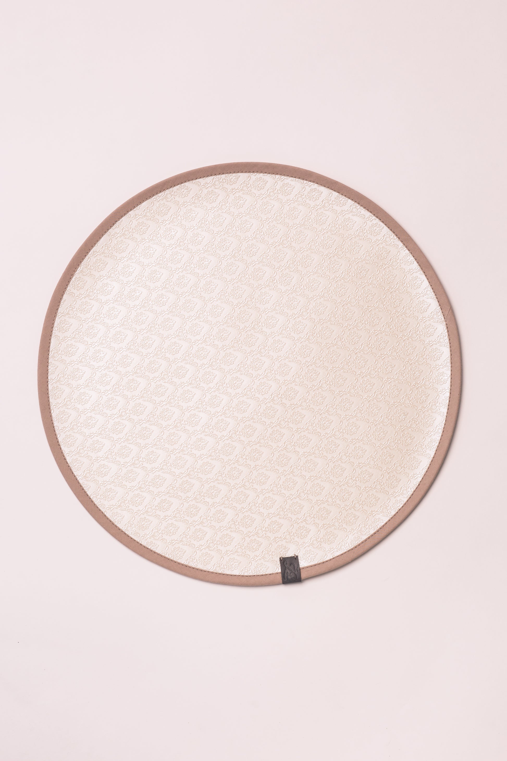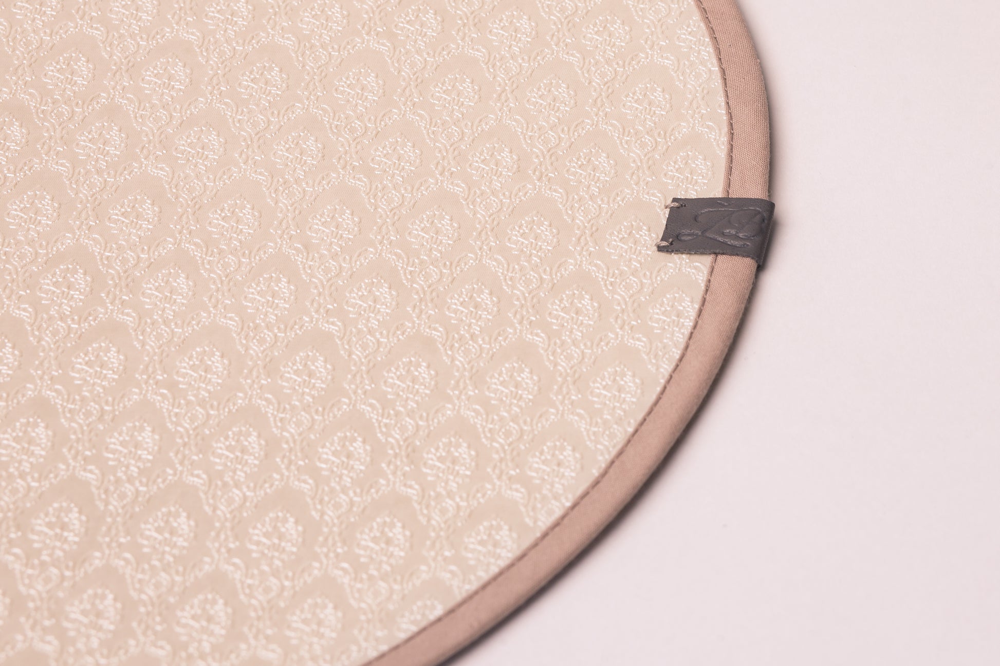 Šviesios spalvos stalo padėkliukas su raštu, apsiūtas rusvos spalvos, pilko atspalvio kantu, su logotipu. Skersmuo 34cm. Eco oda.