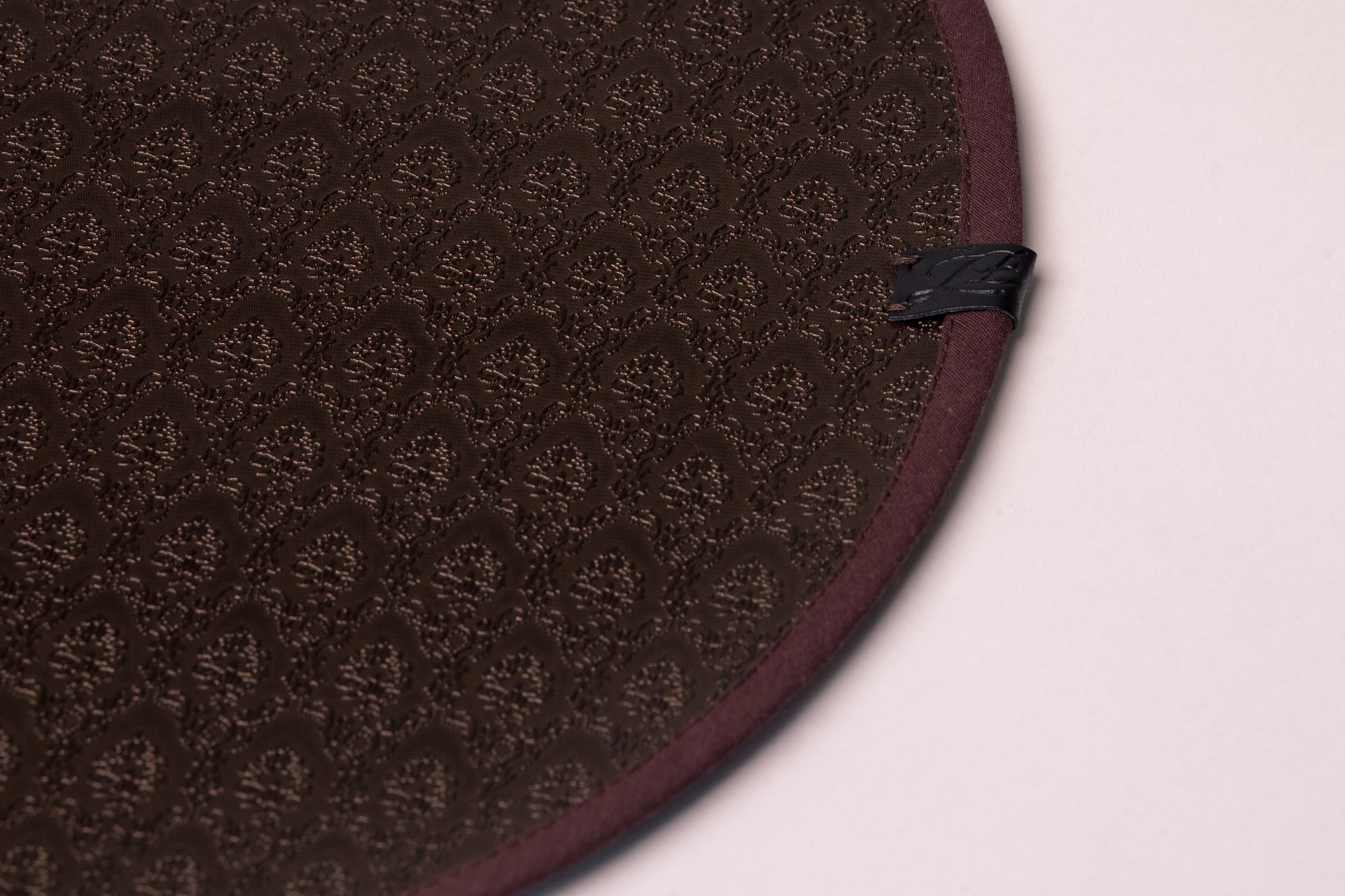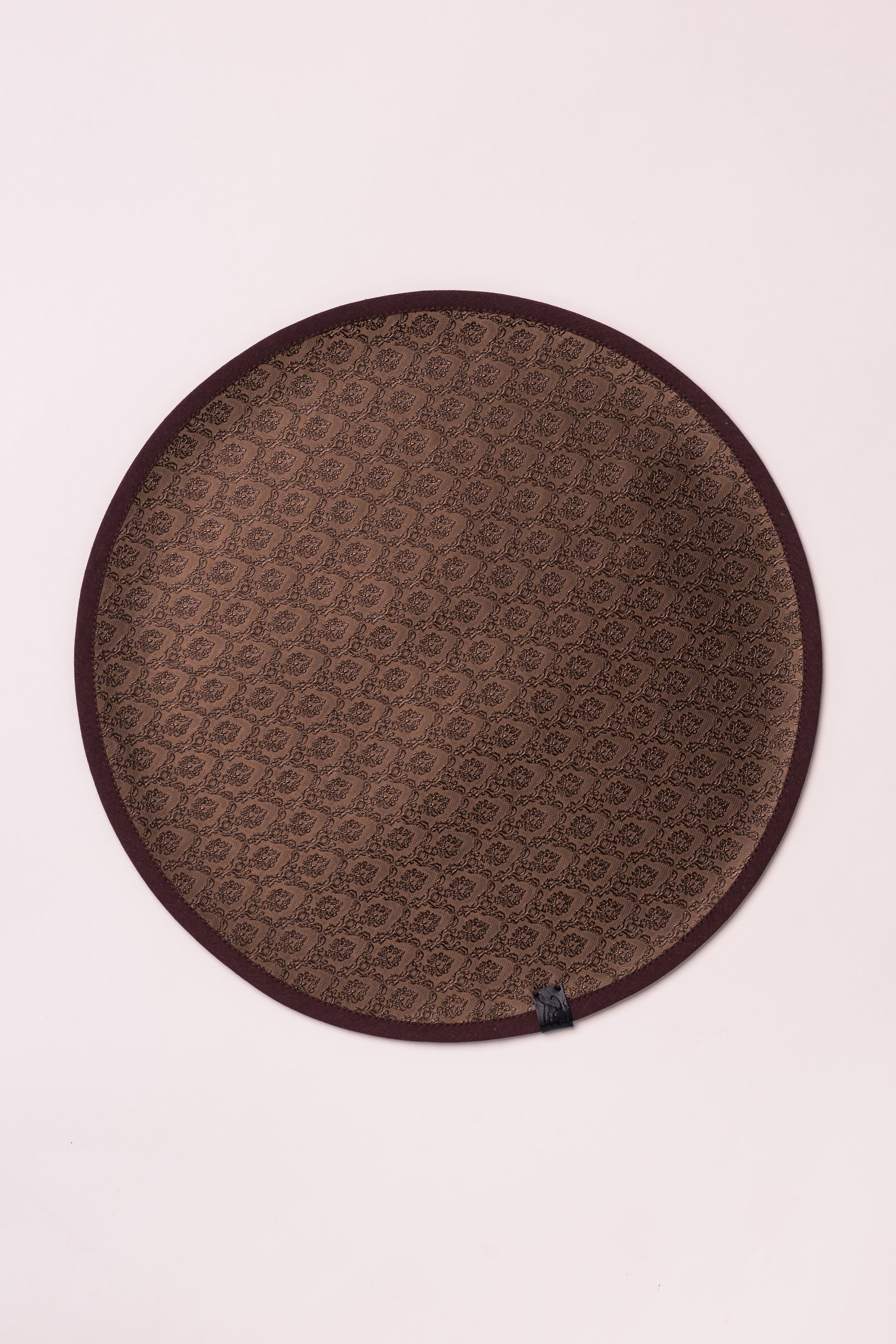 Tamsiai rudos spalvos stalo padėkliukas su raštu, apsiūtas rudos spalvos kantu, su logotipu. Skersmuo 34cm. Eco oda.