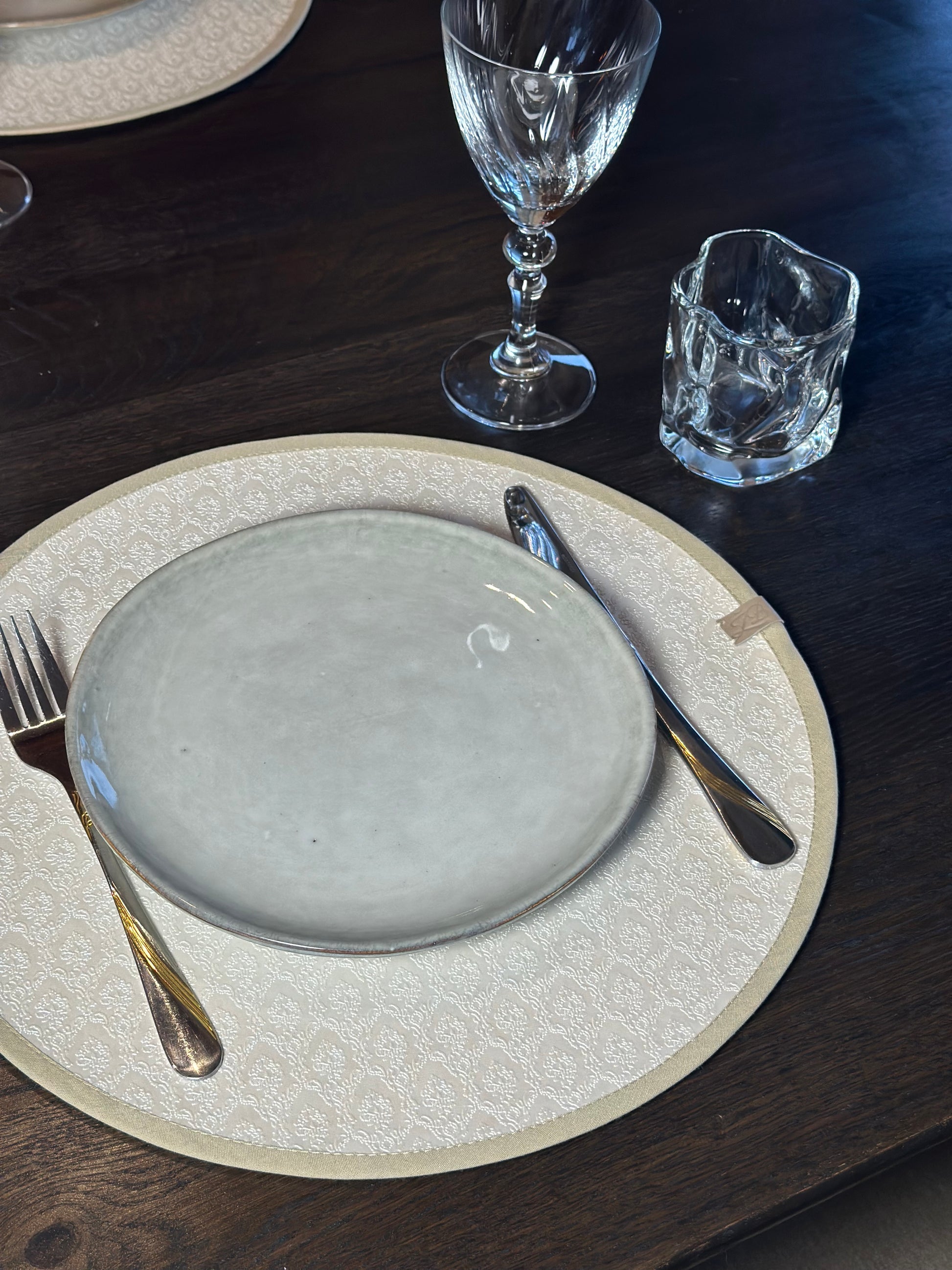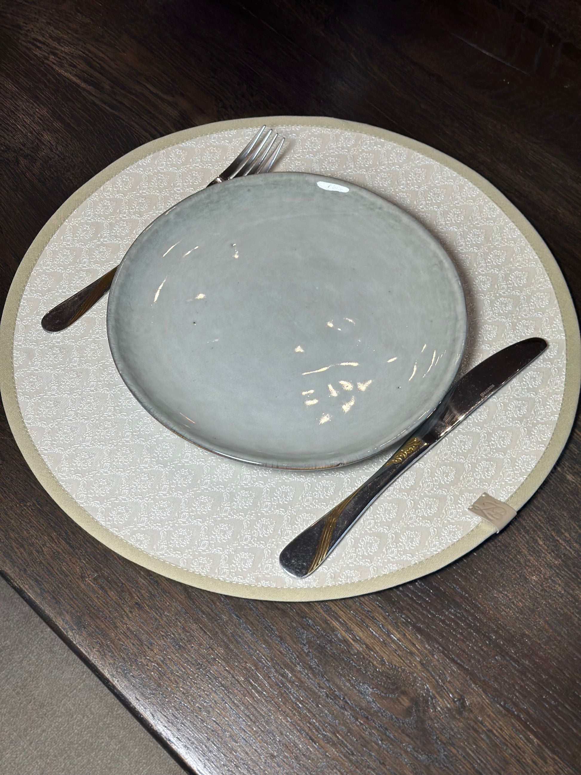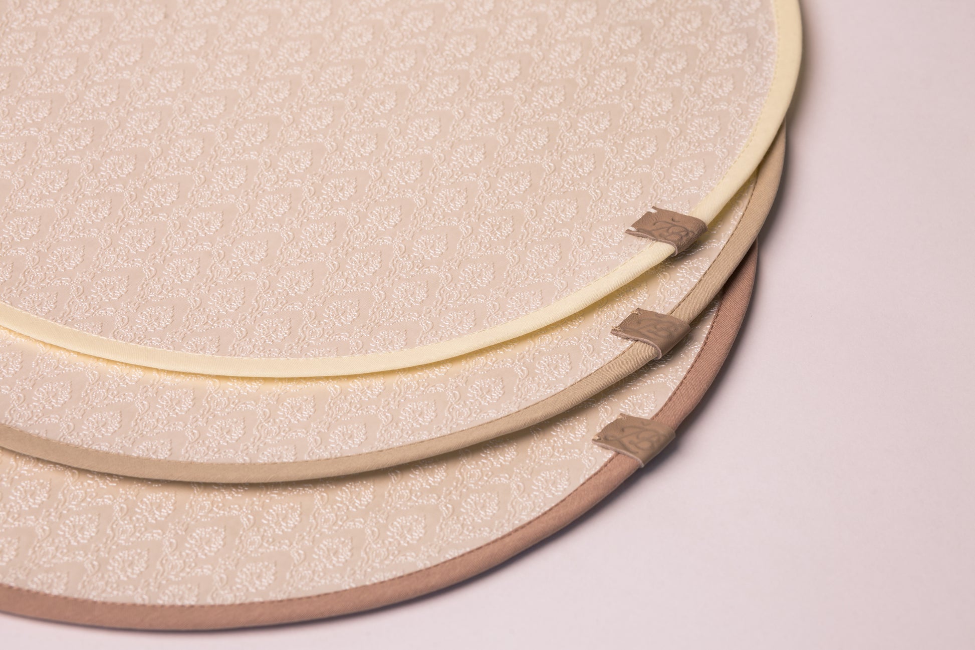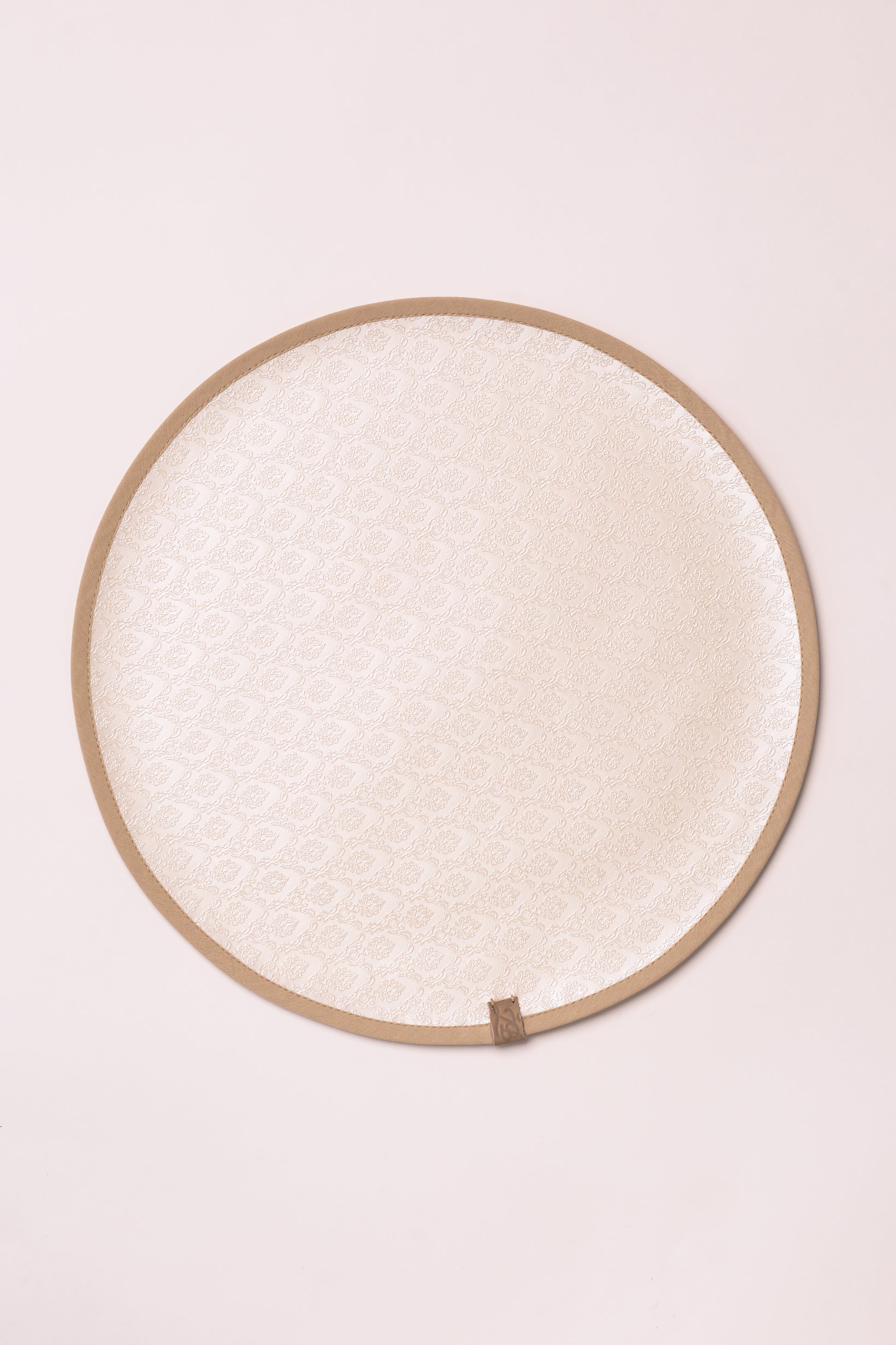 Šviesios spalvos stalo padėkliukas su raštu, apsiūtas rusvos spalvos žalsvo atspalvio kantu, su logotipu. Skersmuo 34cm. Eco oda.